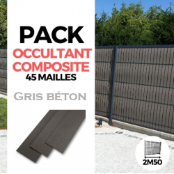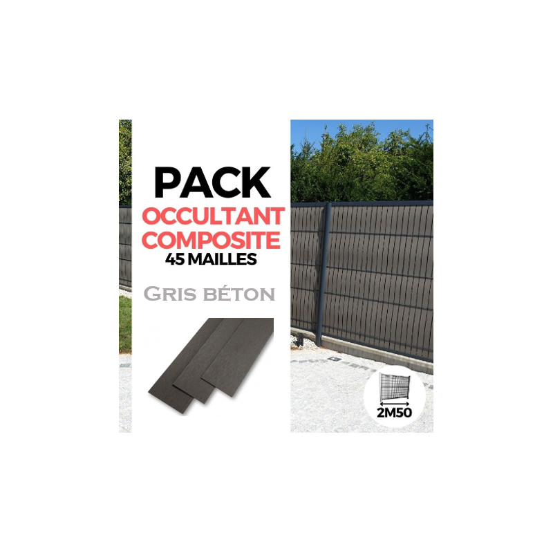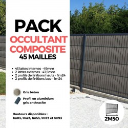 Notre pack occultant, comprend 43 lattes de 49mm, 2 lattes de 43mm ainsi que 2 profils hauts et 2 profils bas de finitions en aluminium, coloris gris anthracite. Idéal pour un panneau rigide de 2m50 de largeur.LES LATTES D'OCCULTATION COMPOSITES sont des éléments essentiels pour créer une clôture ou une barrière esthétique et fonctionnelle dans votre espace extérieur.